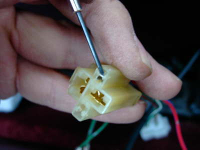 ブレーキペダルスイッチはA/D用は専用で4極ですので交換します。 コネクターは共通です。端子が入っていないだけです。A/D用の端子を、現車のコネクターに移植します。極性を間違えないように。 コネクター外しか精密ドライバーでツメを起こしてやると、端子を後ろに引き抜くことができます。 |