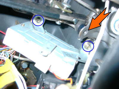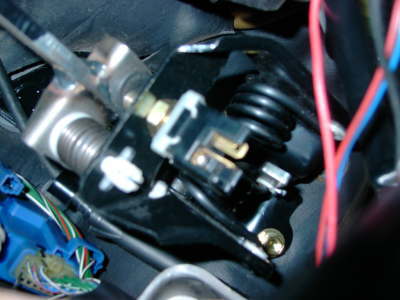 February 15,2006 いよいよ作業も大詰めです。 まずはブレーキペダルスイッチのコネクターを抜き、スイッチを取外し、コンピュータを取付けます。 スイッチは赤矢印の位置ですので、外しておかないと上側(画像右側の青丸)のボルトがとめられません。 またコネクターは挿しておかないと、ベルクランクがジャマであとから挿入するのはムリっぽいです。 |