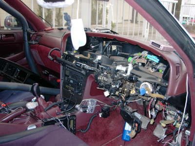 February 17,2006 メーター関係の配線も取るので、インパネからメーターまで引っぺがします。 実際の配線は、後々のメンテナンス性も考えてメーター裏からではなくジャンクションボックス付近から取りました。 部品取り車ではありませんよ。となりの奥さんがこの状況を見て驚いておられました(笑) せっかくばらしたので、ついでにミストワイパー移植も行ってしまいます。 |