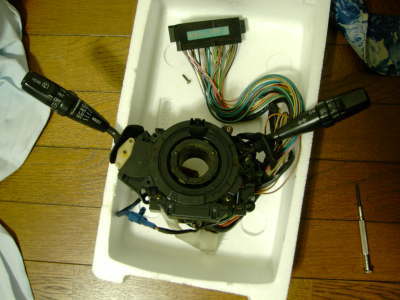January 9,2006 少し時間を戻して・・・ これは30系カムリ解体車からいただいたコンビネーションスイッチ一式。リヤワイパー付です。 ワイパースイッチのみを移植します。 |