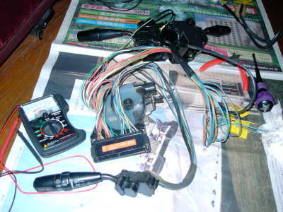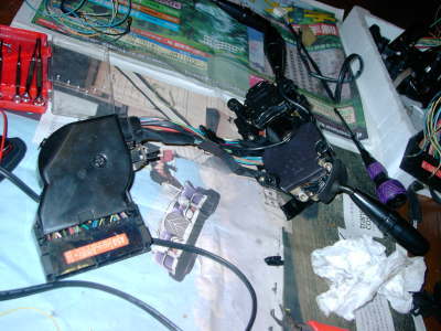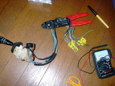 February 17,2006 さて、日付が戻ります。 コンビネーションスイッチASSYを取外し、とりあえずスイッチ本体を移植します。配線はまだつなぎ替えていません。 スイッチ本体がデカくなるので、配線を元通りに収めるのにはやや難儀します。 |